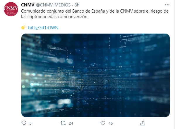 La Comisión Nacional del Mercado de Valores (CNMV) y el Banco de España han emitido un comunicado conjunto advirtiendo sobre el riesgo de las criptomonedas como inversión.