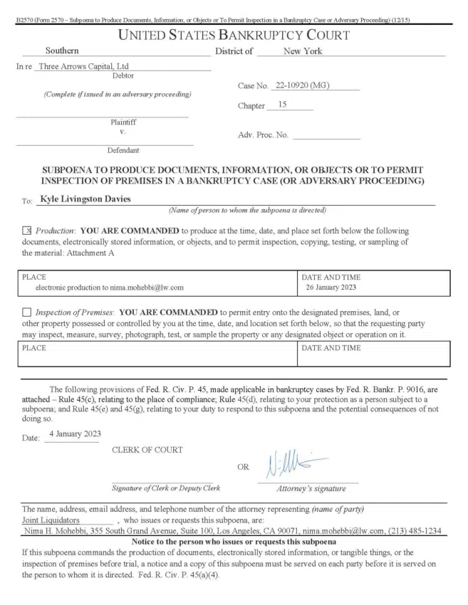Los liquidadores han criticado al cofundador de 3AC, Kyle L. Davies, por no cumplir con una citación. Han solicitado un nuevo pedido con fecha límite el 16 de marzo.