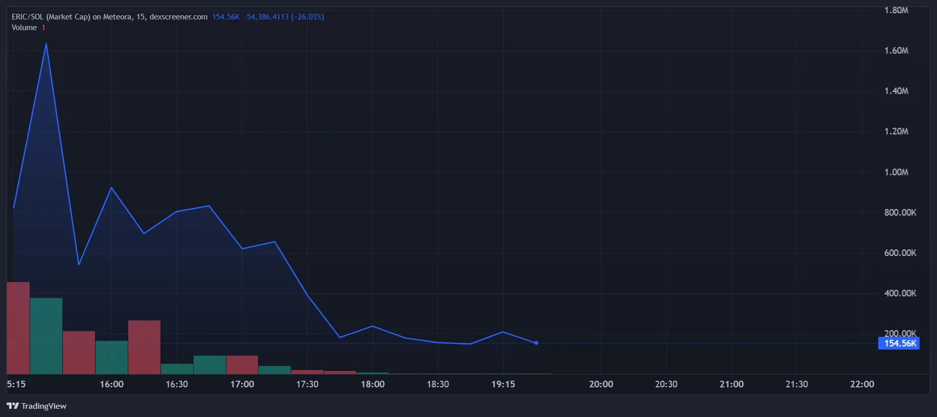 Mientras tanto, la historia fue lo suficientemente viral como para que los entusiastas de las memecoins se involucraran. Un usuario anónimo lanzó una memecoin “Justicia para Eric” en Solana, pero su capitalización de mercado se desplomó casi de inmediato. Quien la lanzó puede no estar relacionado en absoluto con el incidente y solo tener la intención de hacer un rug pull rápido.