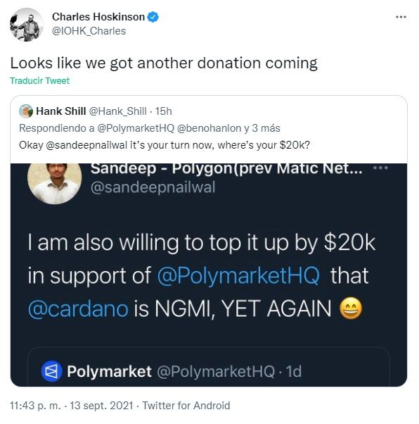 Instantes después del lanzamiento de Alonzo y los smart contracts en la red Cardano llevado a cabo el 12 de septiembre, Charles Hoskinson anunció a través de Twitter que donaría a la caridad los 50 mil dólares de la apuesta ganada a Polymarket.