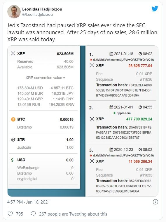 “Jed había detenido las ventas de XRP desde que se anunció la demanda de la SEC. Después de 25 días sin ventas, hoy se vendieron 28,6 millones de XRP.”
