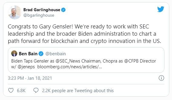 Brad Garlinghouse, CEO de Ripple, felicitó al nuevo ejecutivo el lunes 18 de enero. Gensler es visto como un nombre favorable para el mercado de las criptomonedas. Sin embargo, no se puede decir lo mismo del caso de Ripple en particular.