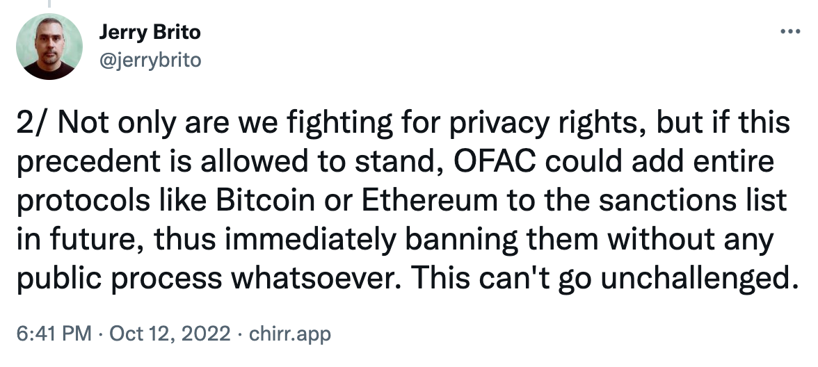 Sponsored“No sólo estamos luchando por los derechos de privacidad, sino que si se permite que este precedente se mantenga, la OFAC podría añadir protocolos enteros como Bitcoin o Ethereum a la lista de sanciones en el futuro, prohibiéndolos así inmediatamente sin ningún tipo de proceso público”