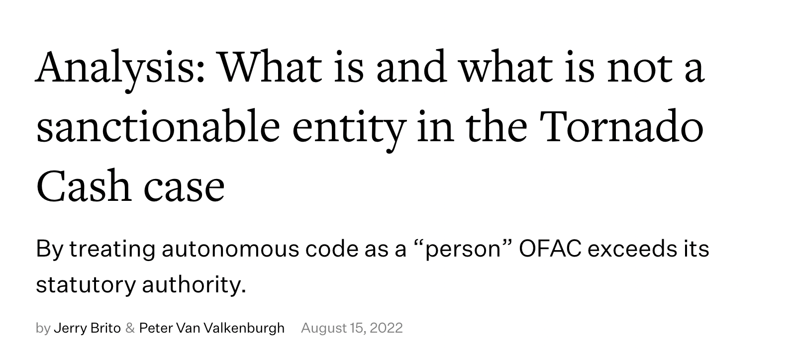 Coin Center dijo que el sitio web de Tornado Cash y algunas direcciones pueden ser objetivos apropiados para sanciones si el Tesoro puede identificar una entidad específica o individuos que la controlan. El grupo dijo que se reservaba el juicio sobre si ese estándar se ha cumplido en este caso, porque los hechos no están completamente disponibles para el público.