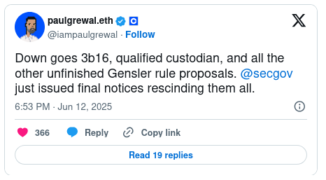“La SEC acaba de eliminar oficialmente la propuesta de expansión de la Regla de Custodia y la Regla 3b-16, además de otras reglas de la era Gensler,” confirmó Eleanor Terrett, presentadora del podcast Crypto America, en una publicación sobre el retiro de la agencia.