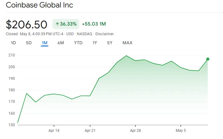 Mientras tanto, los precios de las acciones de Coinbase se han recuperado significativamente desde los aranceles generales de Trump el mes pasado. COIN aumentó más del 36% desde abril, mientras el exchange se prepara para su informe de ganancias del primer trimestre de 2025 más tarde hoy.