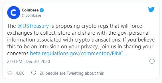 Coinbase, uno de los exchanges de criptomonedas más grandes del mundo, se pronuncia en contra de lo que considera una regulación innecesaria e injusta del Tesoro de los Estados Unidos.