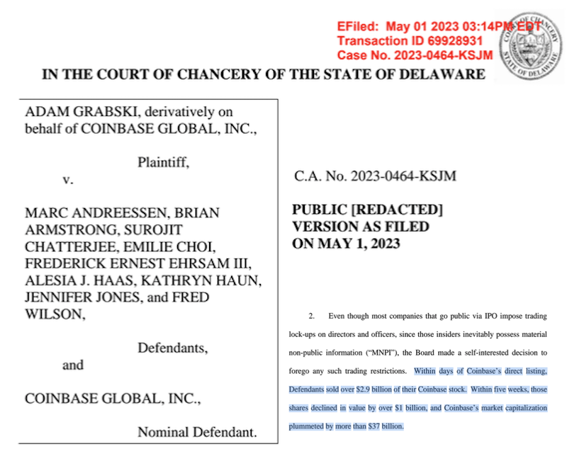 La demanda de Grabski busca la devolución de las “ganancias mal obtenidas” de Armstrong y Andreessen. Además la acusación incluye a la presidenta Emilie Choi, la directora financiera Alesia Hass, la directora de contabilidad Jennifer Jones y el antiguo Director de producto Surojit Chatterjee y los miembros del consejo Frederick Ersham, Fred Wilson y Kathryn Haun.