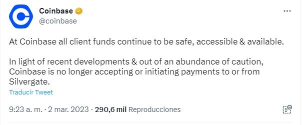 Coinbase anunció en un comunicado que “facilitará las transacciones en efectivo de clientes institucionales con nuestros otros socios bancarios y ha tomado medidas proactivas para ayudar a garantizar que los clientes no experimenten ningún impacto por este cambio”.
