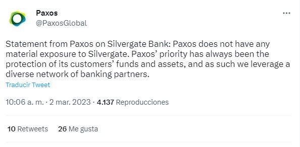 Mientras que Paxos aseguró que “no tiene ninguna exposición material a Silvergate” y que su prioridad es “la protección de los fondos y activos de sus clientes”, por lo que comenzarán a trabajar con otros socios para asegurar que pueden movilizar sus fondos.