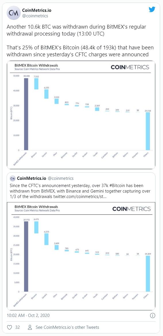 Tras los cargos presentados el jueves 1 de octubre por la CFTC al exchange de criptomonedas rival BitMEX, se registró el retiro de una cantidad récord de Bitcoin durante las siguientes 24 horas.