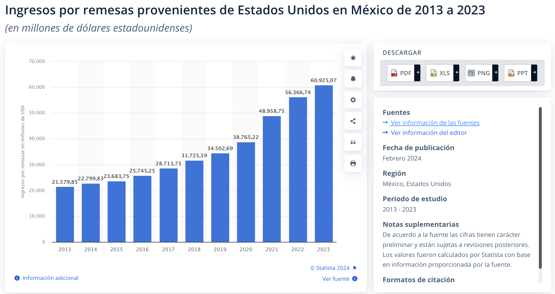 Además, los estados donde más se envías remesas son: California, Texas, Arizona y Florida. Statista reveló que en 2023 ingresaron a México más de 60 mil millones de dólares en remesas provenientes de Estados Unidos.