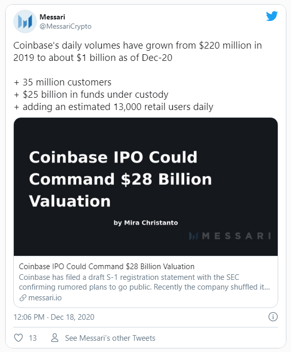 Esto se suma a sus 35 millones de usuarios registrados. Messari llama a Coinbase “el exchange más destacado”. Con el rumor que rodea a las criptomonedas, el primer exchange importante que cotice en bolsa podría experimentar un crecimiento increíble y una alta valoración para arrancar.