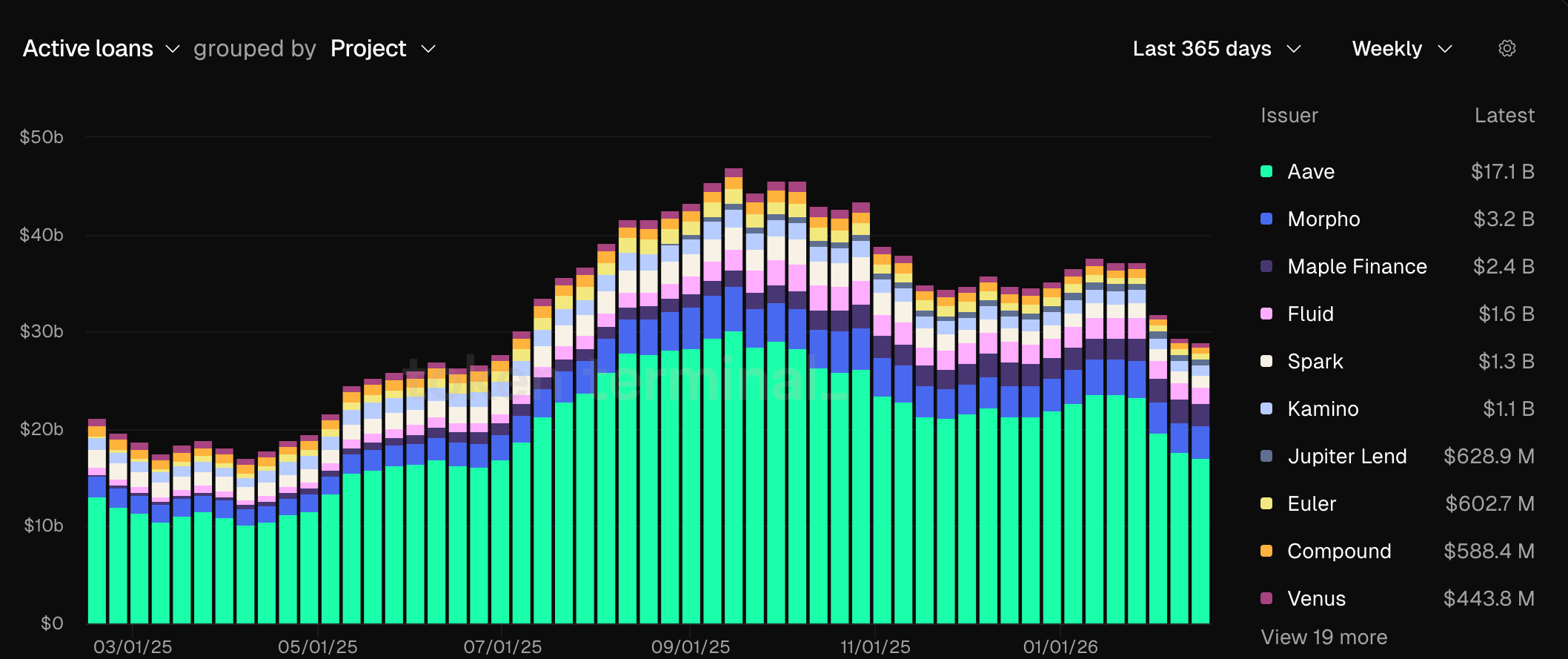 El contexto del sector refuerza la relevancia del anuncio. En febrero de 2026, los préstamos activos en protocolos cripto rondan los 30 mils de dólares, un descenso del 36% desde septiembre.