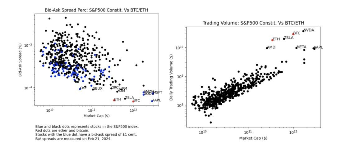 Para demostrarlo, proporcionó gráficos que mostraban que ETH estaba mayoritariamente a la par con otros ETF de activos y acciones aprobados en términos de volumen de trading y diferenciales.