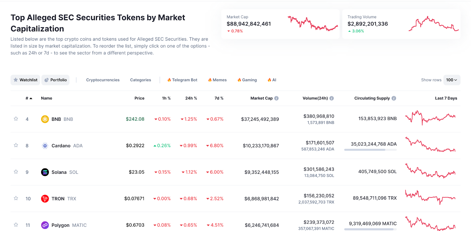 La moneda BNB (BNB), Cardano (ADA) y Solana (SOL) son los tres tokens más grandes basados en la capitalización de mercado que se incluyen en la categorización de “tokens de valores de la SEC alegados” en ambos agregadores de datos.