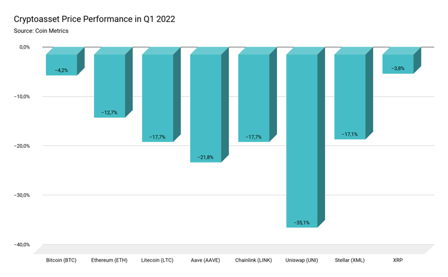 La plataforma líder DeFi, Ethereum, bajó un 12.7% durante el primer trimestre. Activos como Litecoin, Chainlink y Aave también se debilitaron, acercándose mucho al -20%. Uniswap, la exchange descentralizada (DEX), cayó un 35%.