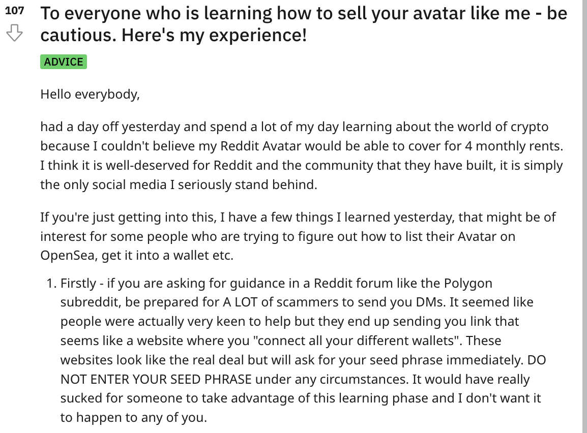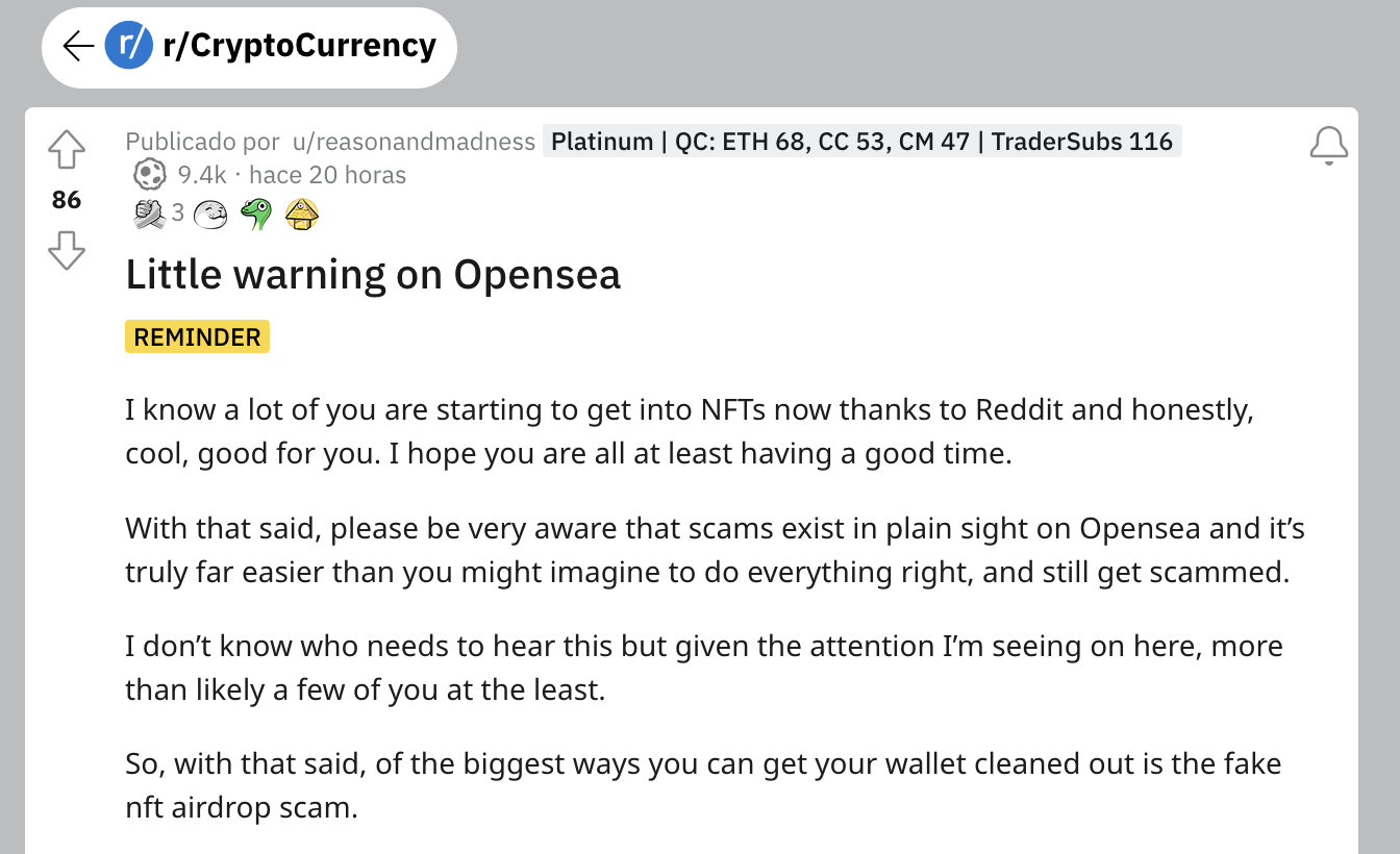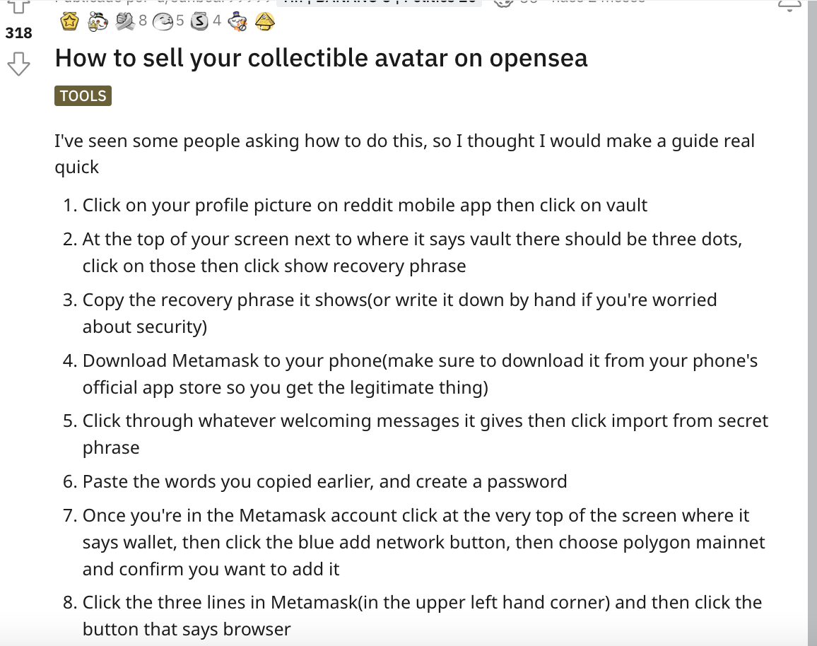 Otro scam se dirige a los usuarios de Reddit que hacen preguntas sobre cómo enumerar sus NFT de Reddit en OpenSea y almacenarlos en monederos. Cuando los usuarios de Reddit publican preguntas en el subreddit de Polygon, los hackers a menudo los dirigen a un sitio web para conectar “todos” sus monederos cripto.