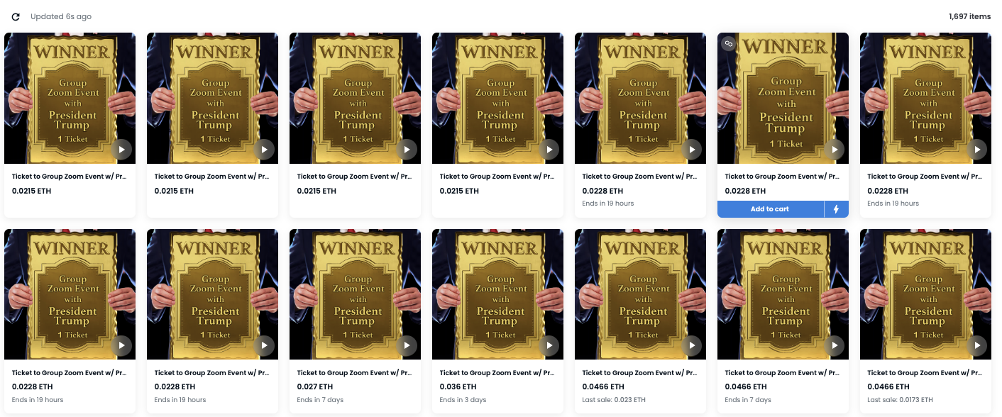 Los NFT de la tarjeta comercial digital de Donald Trump se agotaron con fuerza, recaudando aproximadamente 648 ETH, 785,000 dólares según la tasa ETH durante la venta. Más de 1,000 NFT de tarjetas coleccionables fueron recompensados con una bonificación de premio de sorteo, pero el premio ahora se cotiza tan bajo como 32 dólares.