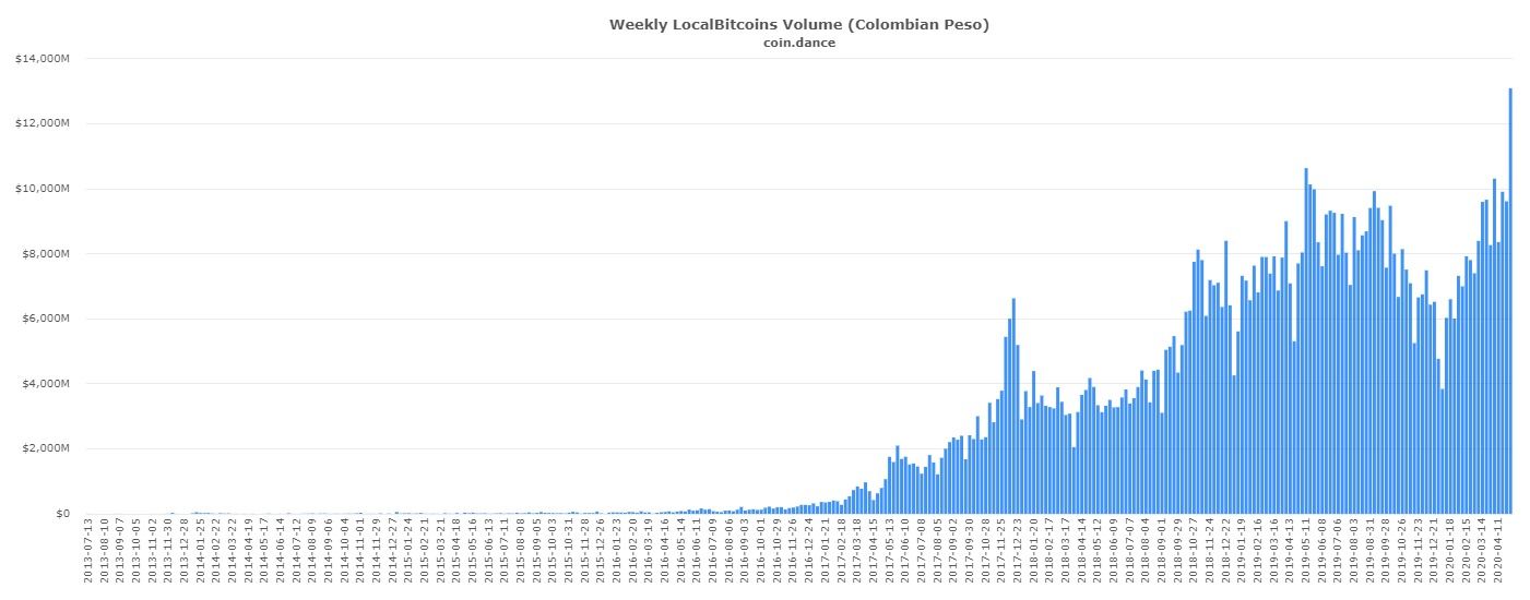 De acuerdo a la plataforma Coin.Dance, durante la semana del dos de mayo los usuarios de dicho país superaron en conjunto el pico de los 13 mil millones de pesos colombianos (COP) intercambiados en la página web. Esto equivale a unos 3,3 millones de dólares y supone un incremento de un 23,11% desde su último máximo histórico en la semana del 11 de mayo de 2019.