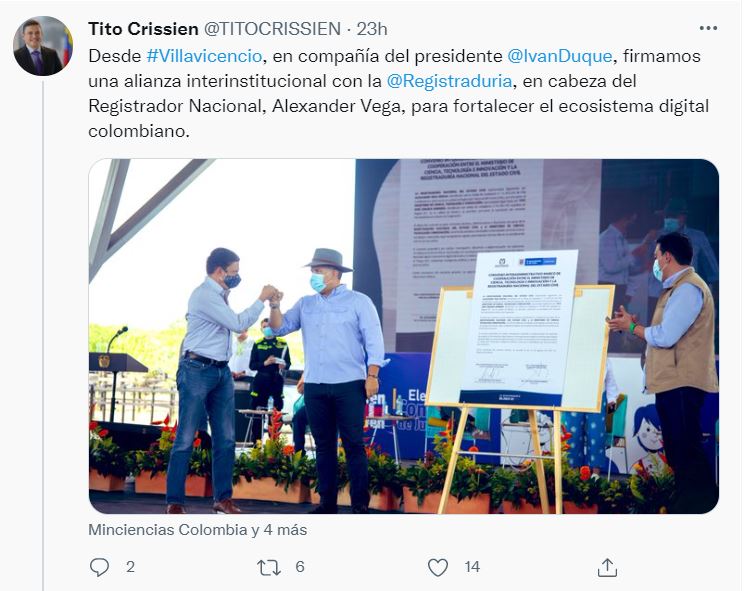 “De acuerdo con la Misión de Sabios, la identidad digital es necesaria para generar condiciones de innovación en Colombia, por eso, con el acuerdo con la Registraduría Nacional, liderada por Alexander Vega, apoyaremos la formulación, investigación, desarrollo e implementación de soluciones tecnológicas como el big data, IoT, blockchain, inteligencia artificial, entre otras, que puedan ser aplicadas a los procesos misionales de la Registraduría Nacional del Estado Civil”.