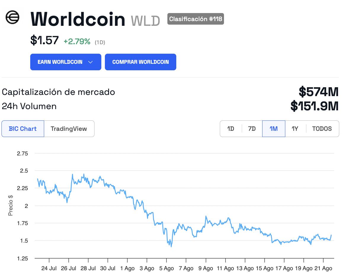 El anuncio parece haber afectado el token nativo de Worldcoin (WLD), el cual pasó de 1,58 a 1,50 dólares, para después situarse en 1,57 dólares. El token está lejos de su máximo histórico (ATH) alcanzado en marzo pasado, cuando llegó a los 11,69 dólares. En tanto, su capitalización de mercado ha pasado de 1,74 mil millones de dólares a 575 millones de dólares.