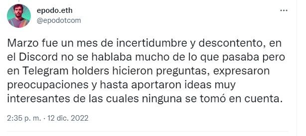 Este detalle choca con la promesa que había hecho Bobby en el episodio de EDN en el que aseguró que el sold out se haría rápido. Como suele suceder cuando una promesa no se cumple, los inversionistas empezaron a preocuparse. En Telegram muchos holders se preguntaban qué pasaba y no se conseguían respuestas.
