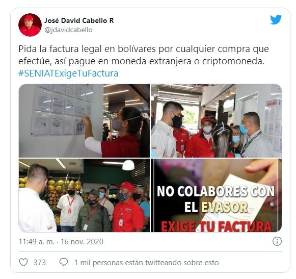 A través de su cuenta en Twitter, el superintendente del SENIAT, José David Cabello, señaló el 16 de noviembre que todos los comercios venezolanos deben emitir factura fiscal en bolívares por todo tipo de compras pagadas en dólares o criptomonedas.