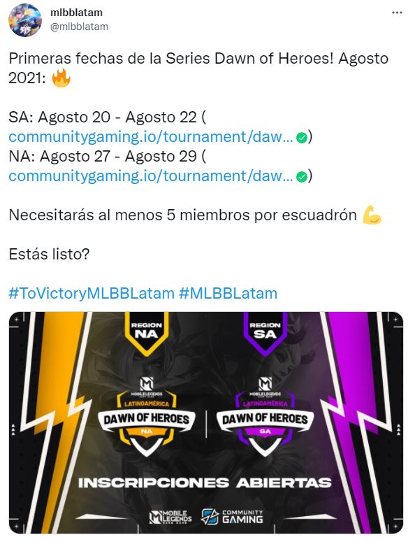 Para su videojuego Dawn of Heroes “Tu Camino a la Victoria”, Mobile Legends promete 36,500 diamantes para los ganadores. Es uno de los torneos más competidos, ya que participan miembros de Colombia, Costa Rica, Ecuador, El Salvador, Guatemala, Honduras, México, Nicaragua, Panamá y Venezuela.