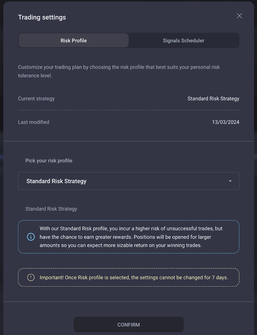 [1] Bajo riesgo: con el perfil de bajo riesgo, los traders se benefician de una mayor tasa de éxito con un riesgo minimizado. Esto es ideal para traders que tienen un umbral de riesgo bajo. Sin embargo, se abrirán posiciones para cantidades más pequeñas, por lo que puede esperar un rendimiento menos sustancial de sus operaciones ganadoras.