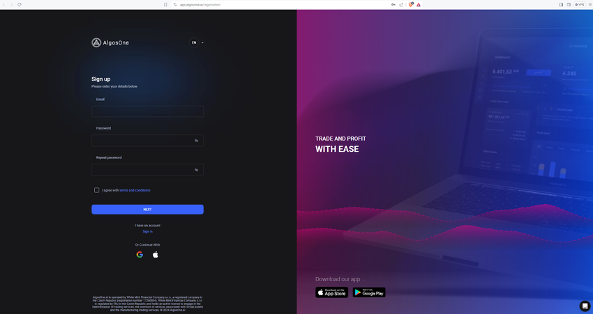 Los usuarios primero deben registrarse para obtener una cuenta en AlgosOne utilizando su dirección de correo electrónico.