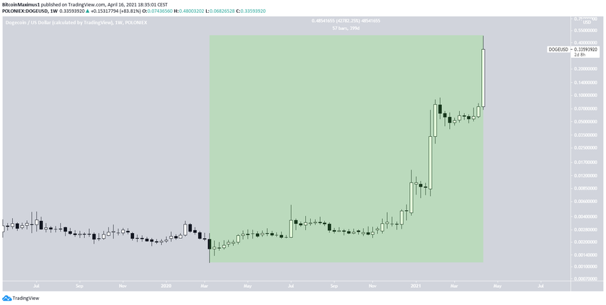 Hasta ahora, DOGE ha aumentado en un 42,782%. El aumento es casi el doble del registrado en 2015. Como resultado, el 15 de abril se alcanzó un nuevo precio máximo histórico de 0,48 dólares.
