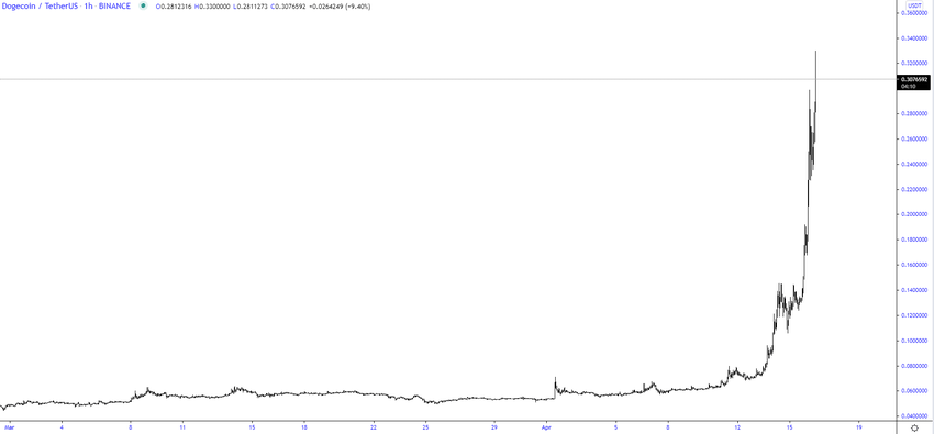 DOGE ha aumentado considerablemente en abril. Como resultado, el trader de criptomonedas @trader1sz tuiteó un gráfico, expresando su incredulidad por el rally actual, que se ha vuelto completamente parabólico.
