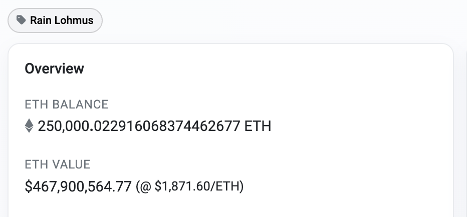 La siguiente captura de pantalla muestra que el monedero de Lõhmus tiene un saldo de 250,000 ETH, con un valor de casi 470 millones de dólares.