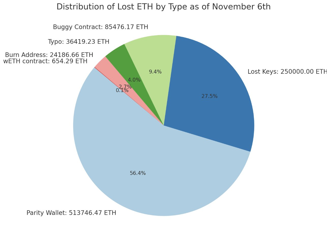 Grogan estima que casi 909,800 ETH, con un valor de más de 1,730 millones de dólares, se han perdido para siempre. La siguiente captura de pantalla muestra la distribución de ETH perdido al 6 de noviembre.
