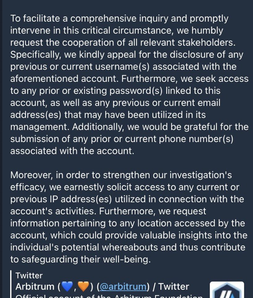 Por ejemplo, explicó cómo los estafadores cripto solicitaron información confidencial para las cuentas X oficiales de Arbitrum, haciéndose pasar por el gobierno italiano. La siguiente captura de pantalla muestra que los estafadores pidieron lo siguiente: