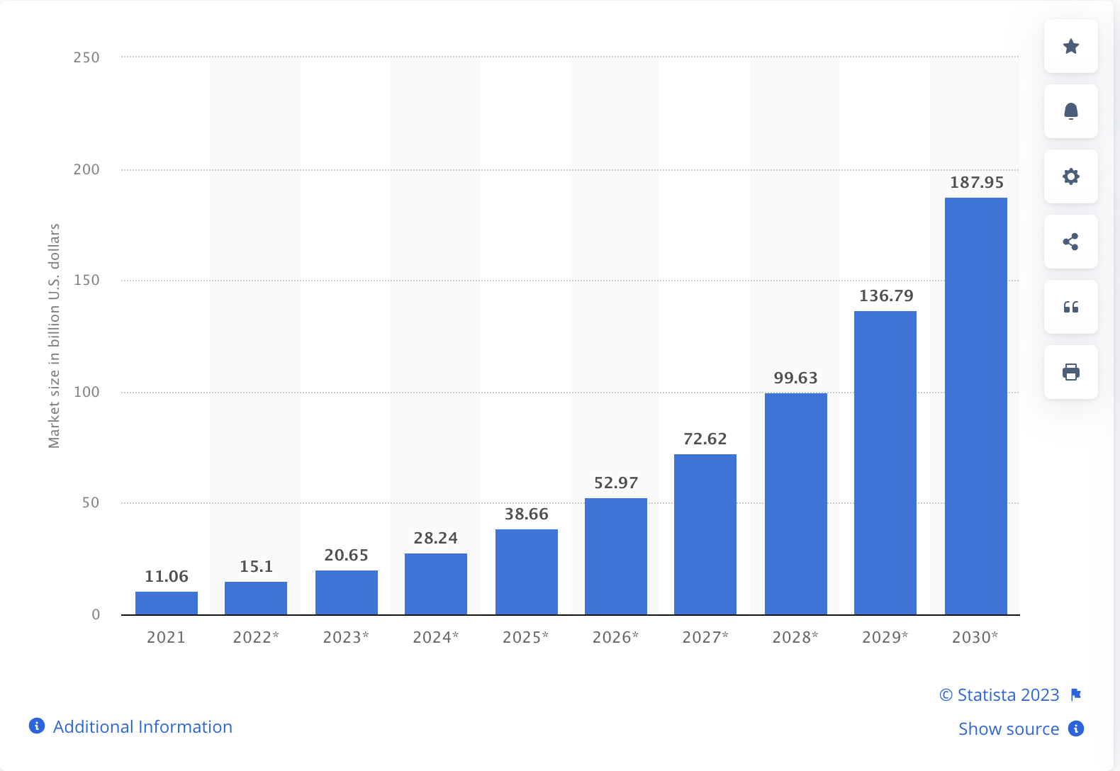 Según Statista, el tamaño del mercado de la IA en la atención sanitaria será de casi 20,65 mil millones de dólares en 2023. Sin embargo, Statista pronostica que el mercado crecerá nueve veces hasta alcanzar los 187,95 mil millones de dólares para 2030.