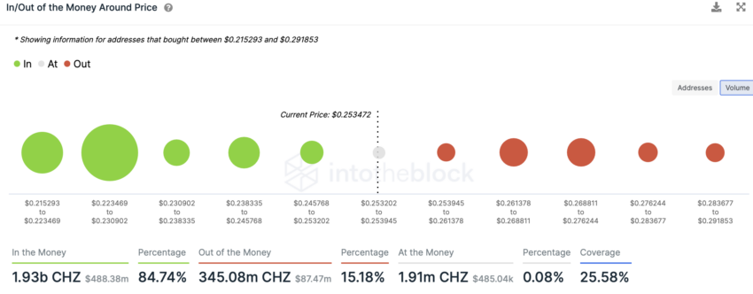 Si las ballenas Chiliz deciden acumular CHZ, lo mismo podría ayudar aún más al impulso alcista del precio. Afortunadamente para los holders de CHZ, el indicador In/Out of Money Around Price de IntoTheBlock no presentó una resistencia significativa para el precio hasta la marca de 0.30 dólares.