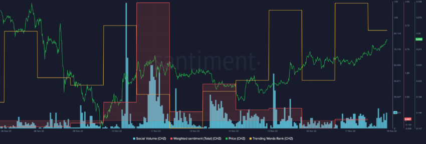 A pesar de que el precio de Chiliz subió a medida que se acercaba la copa del mundo, los volúmenes sociales no experimentaron un aumento importante. El sentimiento social ponderado para CHZ tampoco mostró un repunte importante, pero estaba en territorio positivo.