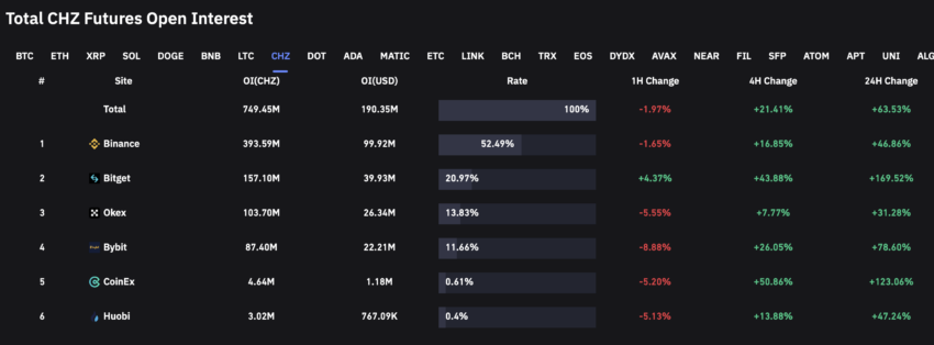 Los datos de Coinglass destacaron que el interés abierto total de futuros de CHZ en los exchanges registró un aumento masivo del 63.53% en las últimas 24 horas. Con la acción del precio volviéndose verde, un aumento en el interés abierto fue una señal alcista ya que representó una compra agresiva.