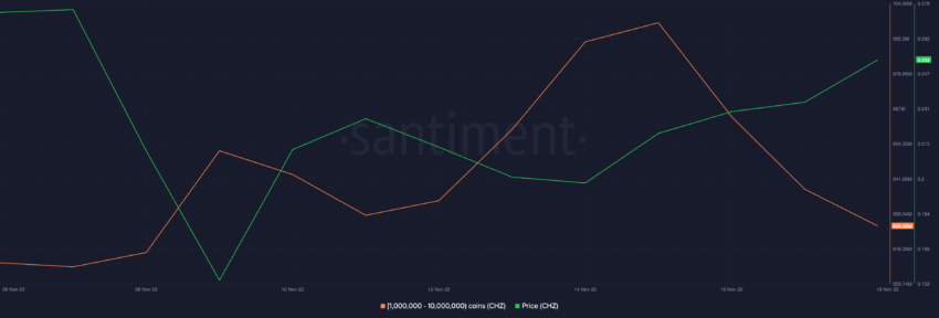 Otra tendencia preocupante para CHZ fue que las direcciones que tenían entre 1 millón y 10 millones de CHZ se deshicieron cerca de 50 millones de tokens de CHZ. Esta cohorte había comenzado a descargar el 15 de noviembre y continuó reduciendo sus carteras.