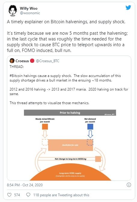 El analista y gurú de los gráficos Willy Woo, cuyo modelo de stock-to-flow aún mantiene su curso, ha observado que han transcurrido cinco meses desde el halving. Agregó que esta fue la cantidad de tiempo en ciclos anteriores que tomó para que los choques de oferta se activaran para hacer que el precio de Bitcoin se disparara al siguiente rally.