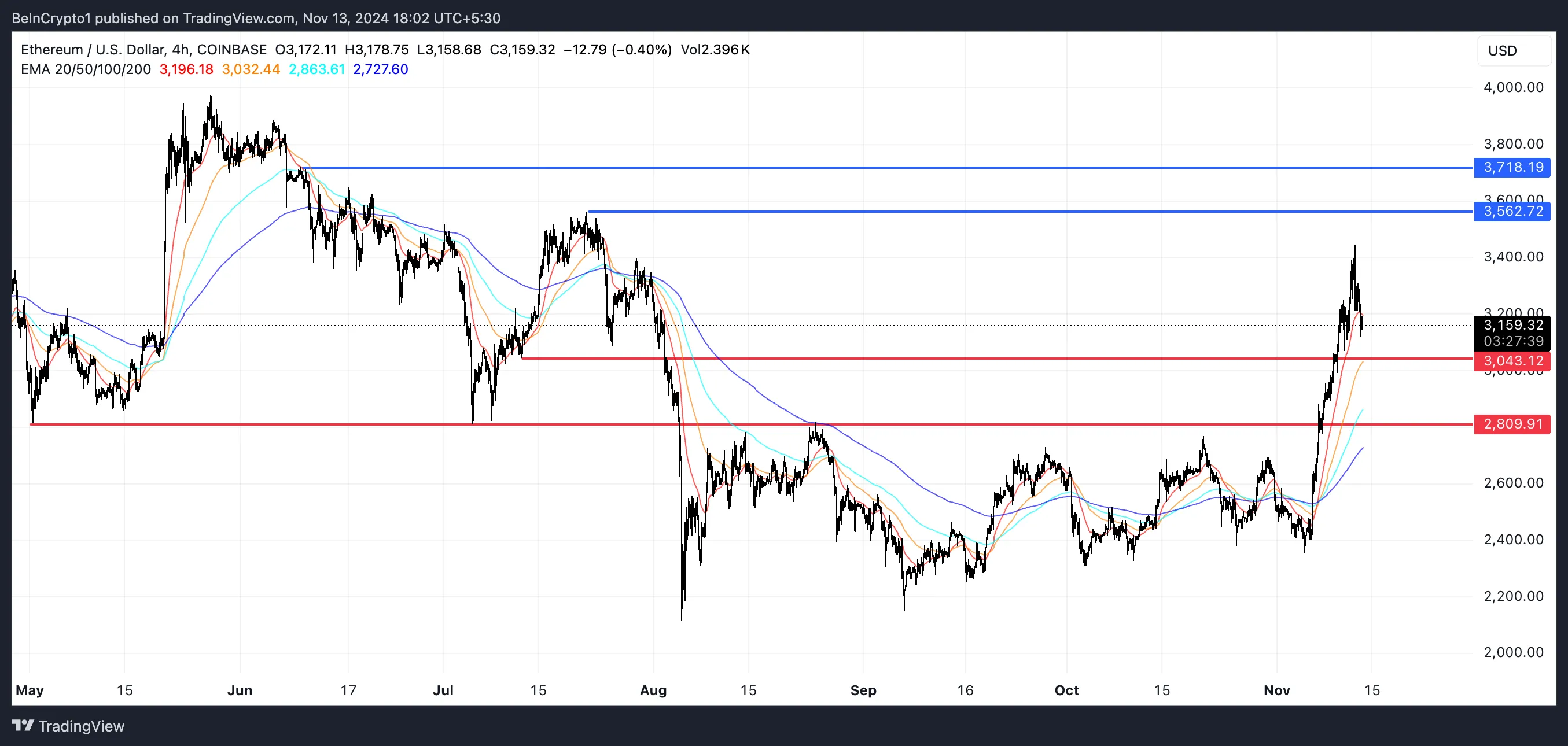 Si esta resistencia se rompe, el precio de ETH podría potencialmente dispararse hasta 3,700 dólares—un posible aumento del 17,9% y su nivel más alto desde junio. Por otro lado, si la tendencia alcista se revierte, el precio de ETH podría volver a probar el soporte en 3,000 dólares. Si eso falla, el siguiente nivel de soporte sería alrededor de 2,800 dólares.