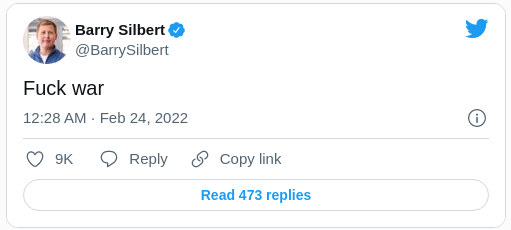 Barry Silbert, CEO del grupo de activos digitales más grande de Estados Unidos, Digital Currency Group, tuiteó: “A la mierda la guerra”.
