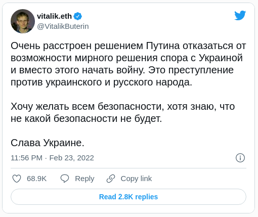 El cofundador de Ethereum, Vitalik Buterin, fue una de las primeras voces en criticar la invasión rusa de Ucrania. Buterin describió la acción como un crimen contra los pueblos de Ucrania y Rusia.