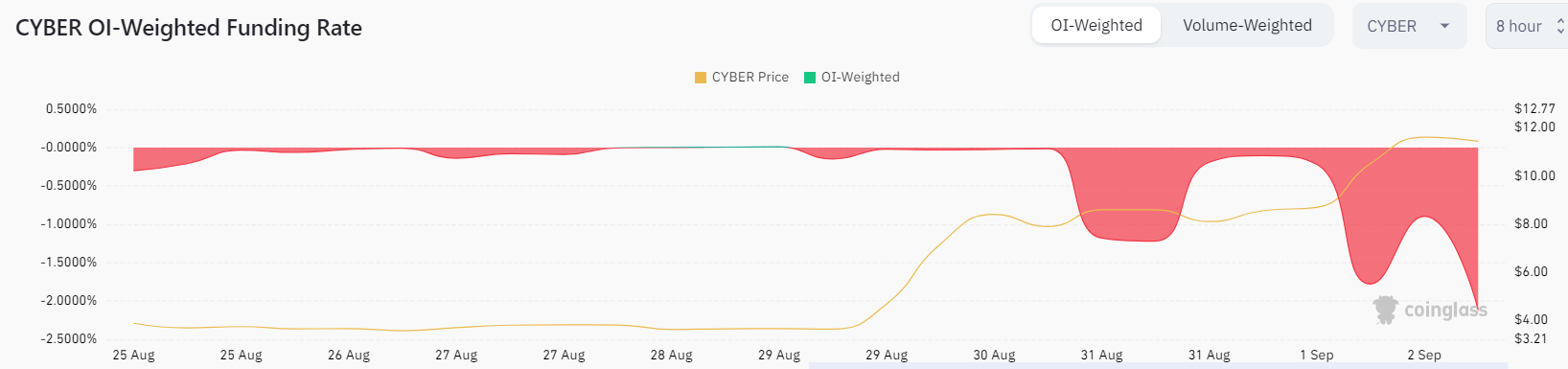 Los datos de Coinglass revelan que en las últimas 24 horas, el volumen de operaciones de contratos perpetuos CYBER aumentó a la impresionante cifra de 10,800 millones de dólares, lo que supone un asombroso aumento del 299,9%.