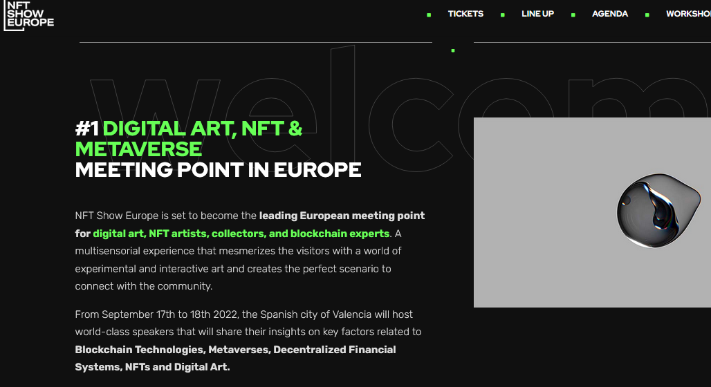 NFT Show Europe se convertirá en el principal punto de encuentro europeo para los expertos en metaverso, blockchain y criptoarte, con multitud de talleres y oportunidades de inversión. El evento contará con ponentes de talla mundial como Hide Uehara, Sam Hamilton, Laurent Perello, Zancan. #NFTSE22 tendrá lugar el 17 y 18 de septiembre en Valencia, en la Ciudad de las Artes y las Ciencias, y el público podrá disfrutar de experiencias en realidad virtual, arte interactivo y pantallas robóticas