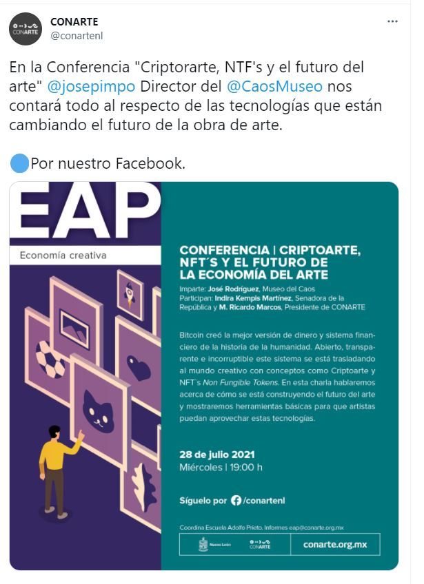 El Consejo para la Cultura y las Artes de Nuevo León (CONARTE) realizará este 28 de julio por la noche el foro virtual “Criptoarte, NFT’s y el Futuro de la Economía del Arte” a través de su cuenta de Facebook @conartenl, donde se prevé abordar el futuro de la creatividad y el consumo.