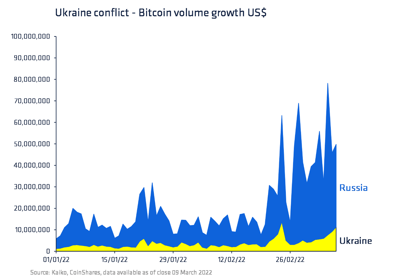 Según los datos de CoinShares, el comercio de criptomonedas en Ucrania aumentó 107% desde que comenzó el conflicto. Mientras tanto, esta cifra ha aumentado a 231% en Rusia con el colapso del rublo y su sistema bancario cada vez más aislado.