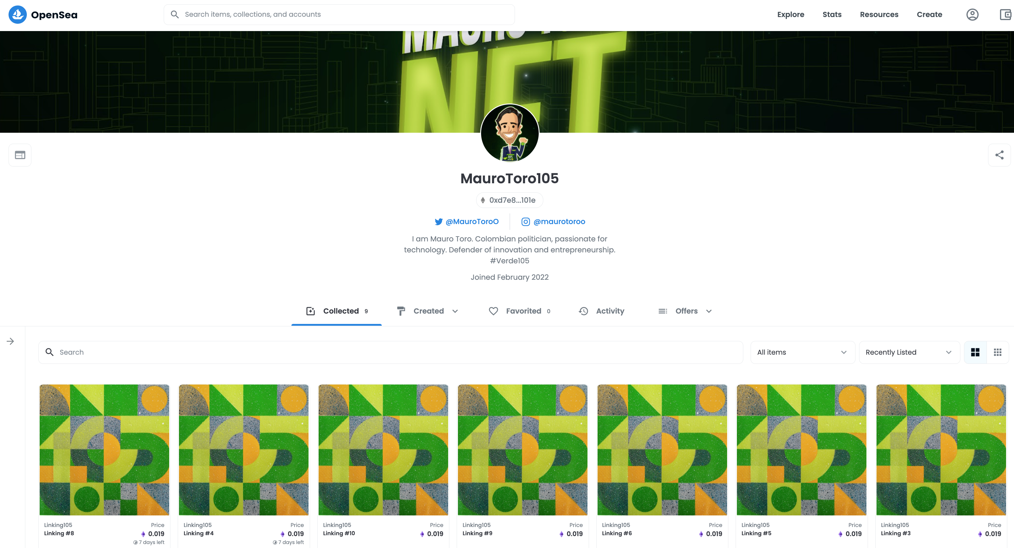 La obra que ha puesto en venta el político colombiano recibe el nombre de Linking, y tienen un valor de 0.019 Ethereum (ETH).